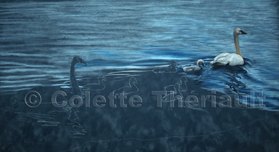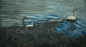 Pastel painting of a Trumpeter swan family.