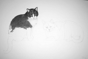 Although rather difficult to see clearly, this is the basic sketch outline for the cat portrait.