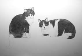 After filling in  the steps with shading  I define the shadows around both cats. .Boots' and Tipper's portrait is now complete.